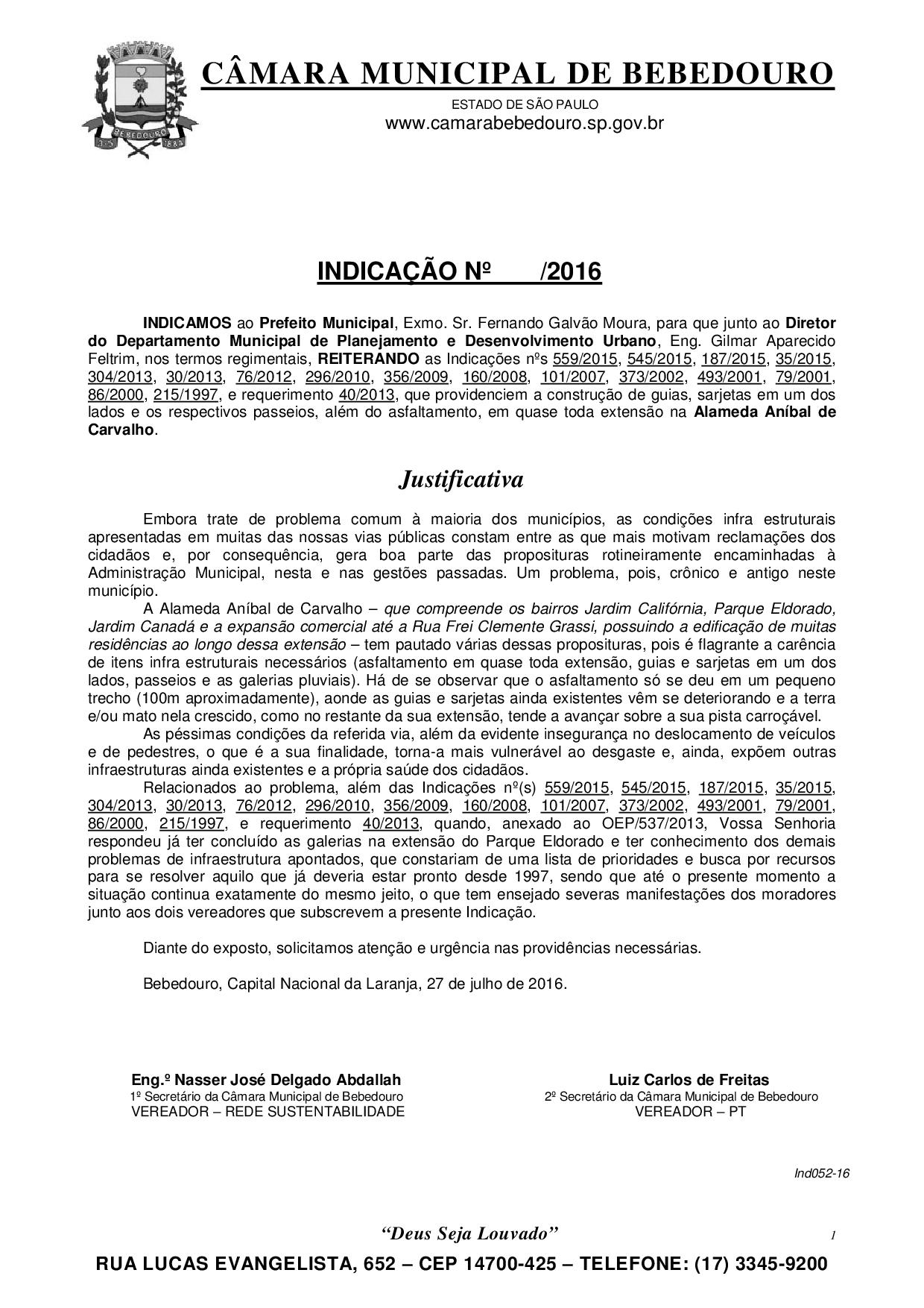 Assunto: Indicam ao Prefeito Municipal, junto ao Diretor do Departamento Municipal de Planejamento e Desenvolvimento Urbano, REITERANDO as Indicações nºs 559/2015, 545/2015, 187/2015, 35/2015, 304/2013, 30/2013, 76/2012, 296/2010, 356/2009, 160/2008, 101/2007, 373/2002, 493/2001, 79/2001, 86/2000, 215/1997, e requerimento 40/2013, que providenciem a construção de guias, sarjetas em um dos lados e os respectivos passeios, além do asfaltamento, em quase toda extensão na Alameda Aníbal de Carvalho.